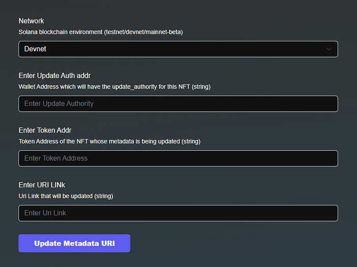 Before we start the process of updating the metadata, we have to check if we have the authority to update that particular NFT. For a user to update the metadata of an NFT, the user’s wallet should have the update authority for that NFT. Update authority for any NFT is defined when the NFT is created and does not change even if the NFT is traded from one wallet to another. We also need a few other pieces of information related to the NFT before we proceed to update the NFT. We have used a simple form (on React) to collect the details of an NFT, but any other method can be used as per requirement or convenience.